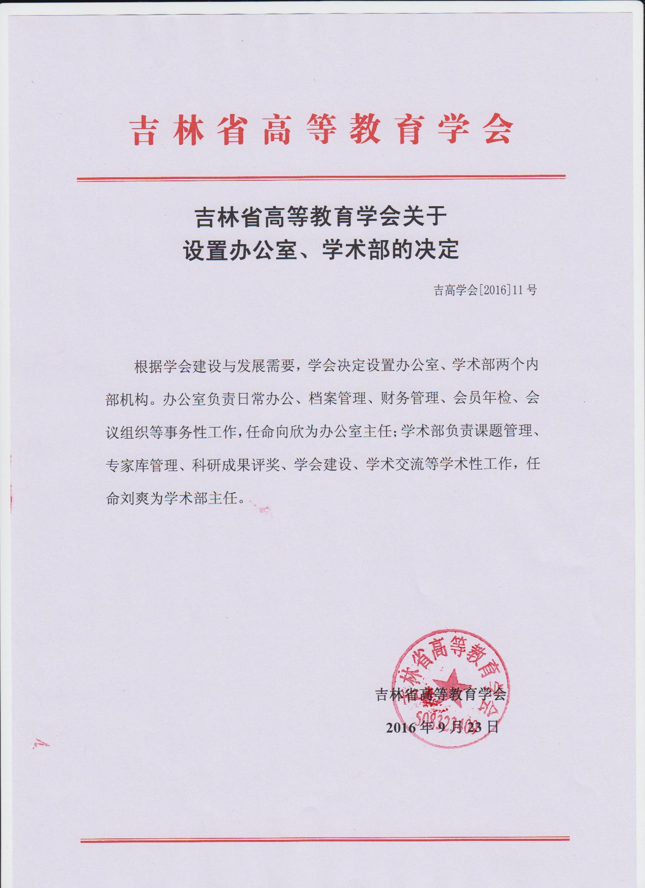 吉林省高等教育学会关于 设置办公室、学术部的决定 吉高学会[2016]11号 根据学会建设与发展需要,学会决定设置办公室、学术部两个内部机构。办公室负责日常办公、档案管理、财务管理、会员年检、会议组织等事务性工作,任命向欣为办公室主任;学术部负责课题管理、专家库管理、科研成果评奖、学会建设、学术交流等学术性工作,任命刘爽为学术部主任。 吉林省高等教育学会 2016年9月23日 ![]() (责任编辑:admin) |